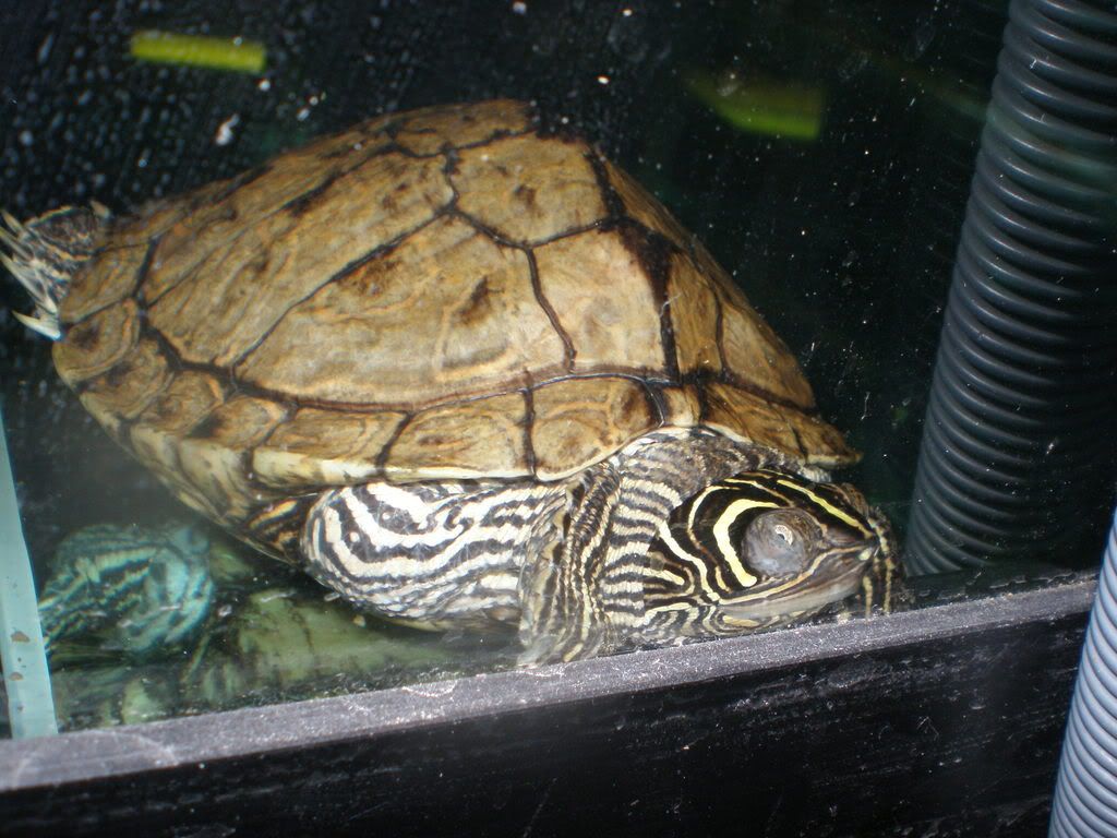 As this scheduled entry posts, I'm probably sleeping like Jay is in the above photo. Except I'm on a chaise lounge, not the bottom of a 125 gallon aquarium. He's a Map Turtle, pic taken with an Olympus FE-180.